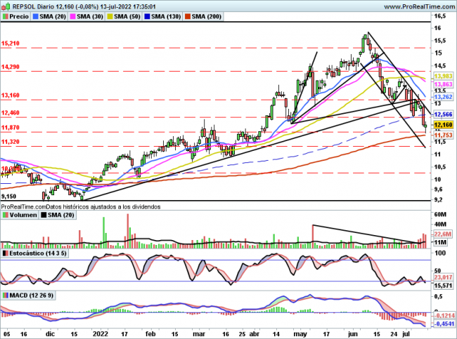 De momento el precio de REPSOL parece haber apoyado en un pequeño GAP alcista que había dejado en el mes de abril antes de la ruptura de máximos, este GAP de 11,87€ es clave, si se mantiene por encima de aquí es previsible que el precio pueda rebotar en el corto plazo hasta 12,46€/12,50€, nivel que coincide con el mínimo previo a  este impulso bajista y que a su vez coincidiría mas o menos con el techo del canal bajista actual.