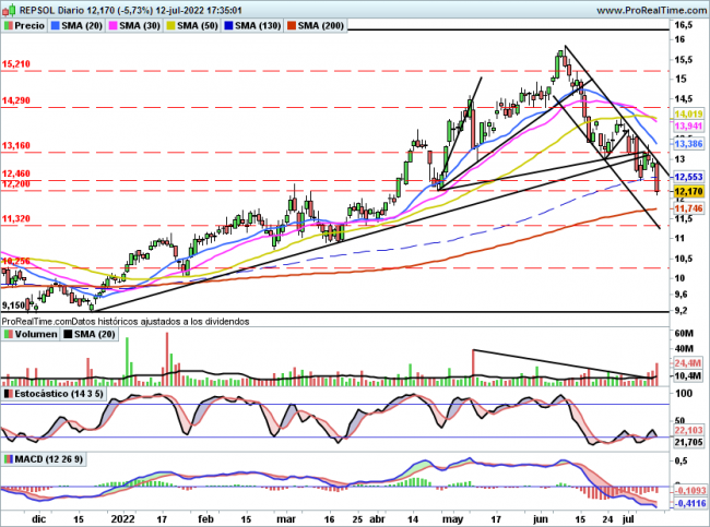 La situación técnica se ha ido deteriorando, 1º perforaba le mínimo de hace 1 semana en 12,46€ y posteriormente hacia lo propio con los 12,20€ que fue el mínimo de abril, al cierre ha quedado la cotización en 12,17€.