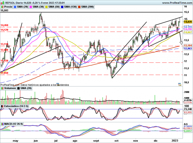 Por debajo su primer soporte se encuentra en el nivel de 14,45€, si fuese perforado únicamente quedaría la zona de 14,12/14,00€, zona que en caso de ser perforada podría llevar al precio hacia los 13,11€ que es la media de 200 sesiones y un antiguo soporte.