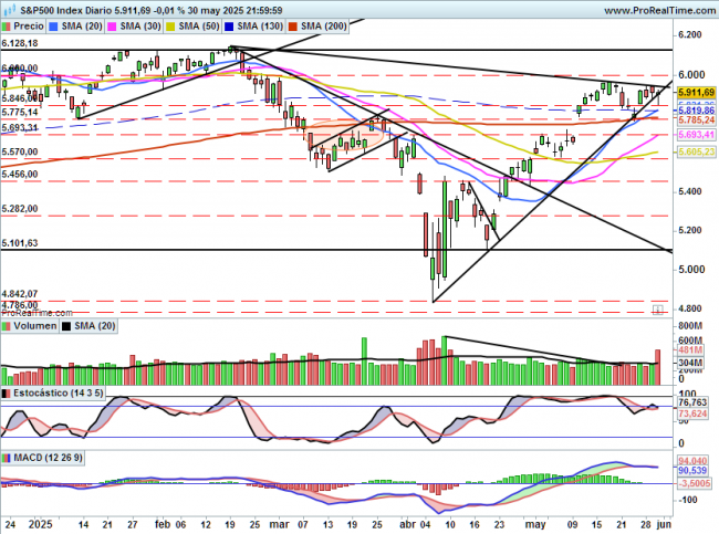 A corto plazo todo sigue un poco igual , por arriba el techo en la zona de 6000 es muy evidente y por debajo la media de 200 en 5775 sigue siendo el soporte clave.