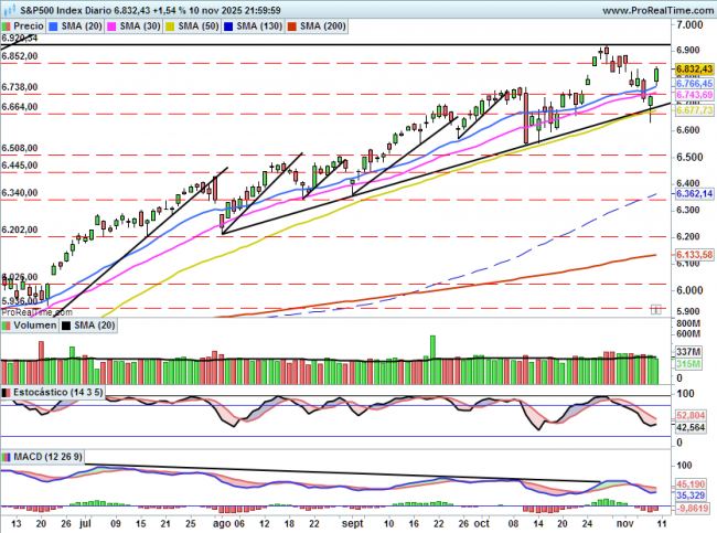 De momento todo bien, el mercado ha recuperado en 1 día la caída de prácticamente 4 sesiones, alcanzando el GAP bajista de 6852. No obstante la resistencia importante la tiene en 6920 puntos que son máximos históricos, superarlos implicaría entrar en subida libre.
