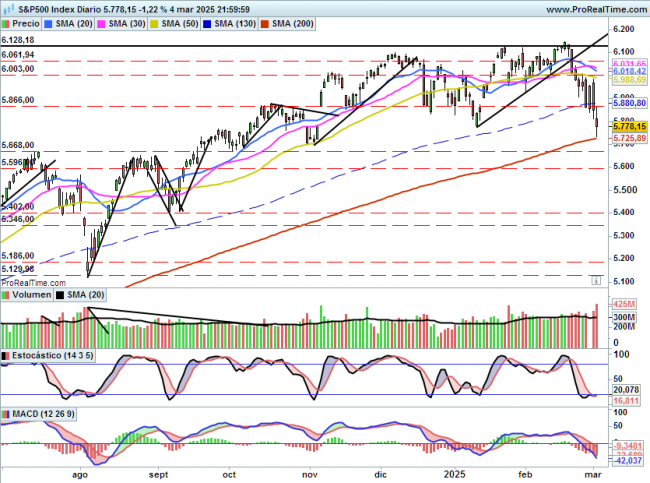 A corto si el índice se mantiene por debajo de 5866 la situación sigue siendo bajista, siendo el siguiente soporte clave el nivel de 5660 que fue la zona de máximos de julio/agosto y posterior zona de soporte de septiembre noviembre, es el punto clave y mas importante.