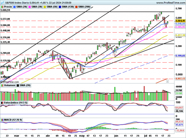 SP500: De momento rebota a la primera marcada en 5572 puntos.