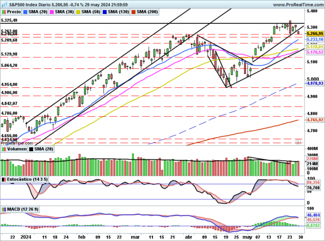 De momento no pasa nada, como se puede ver ha aguantado por encima de 5260 de momento, solo la pérdida de 5246 activaría una corrección con objetivo en 5170 puntos.
