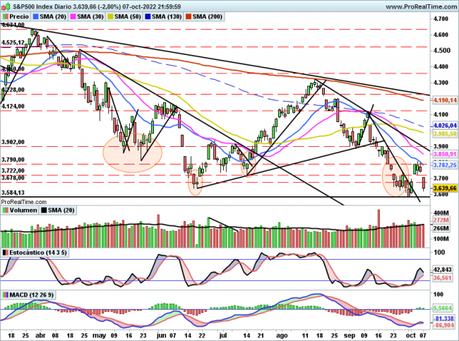No obstante mientras no pierda al cierre mínimos anteriores en 3584 es de esperar que pueda volver a rebotar (salvo desastre en el dato del IPC) , en ese sentido seguiría vigente la expectativa de alcanzar al menos la zona de la directriz bajista entre 3850/3900 puntos.
