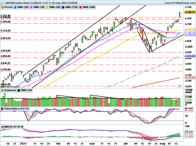A corto no existe soporte al menos hasta la zona de 5260/5246 puntos que es el máximo previo y GAP alcista de hoy, mientras se mantenga por encima seguirá la subida libre.