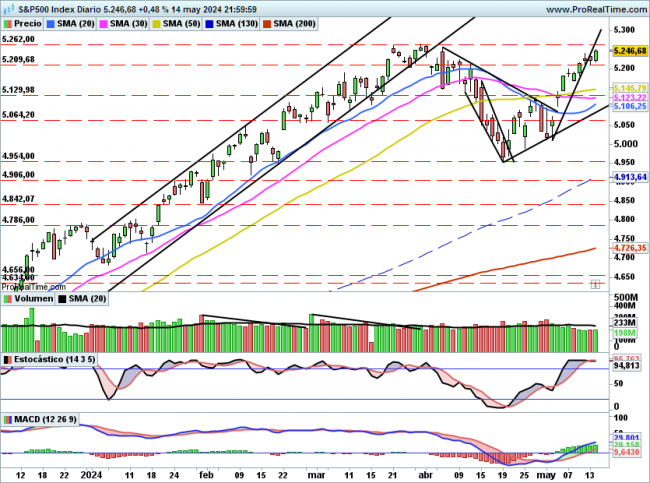 De momento sigue aguantando el GAP alcista y nivel clave de 5209 puntos, mientras se mantenga por encima sigue el objetivo en 5262 puntos.
