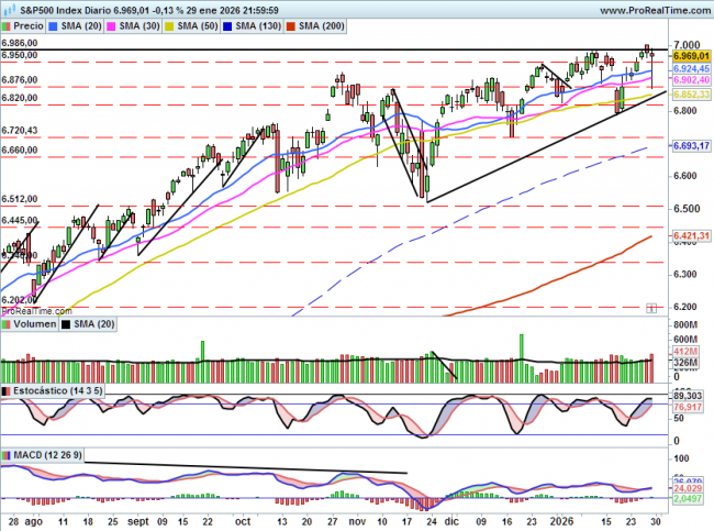 Un cierre por debajo de 6870 aceleraría caídas hacia soportes como 6820 (mínimo de enero) o 6720 mínimo de diciembre.
