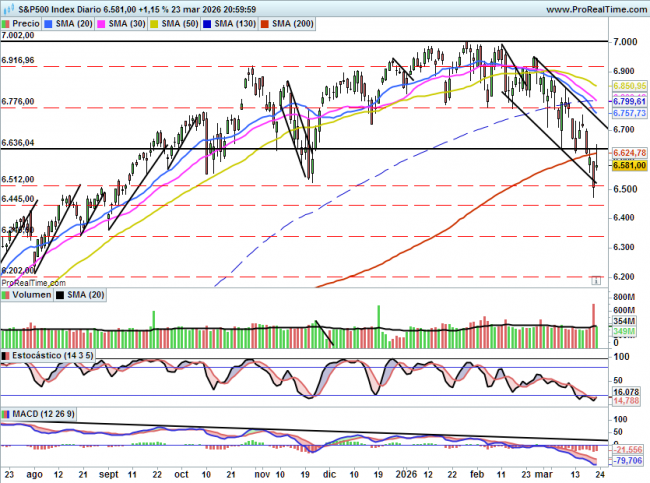 Pese a todas las noticias el mercado lograba rebotar hasta la gran resistencia clave de 6636 aunque no pudo consolidarse por encima, finalmente ha cerrado nuevamente por debajo tanto del nivel clave como la media de 200.