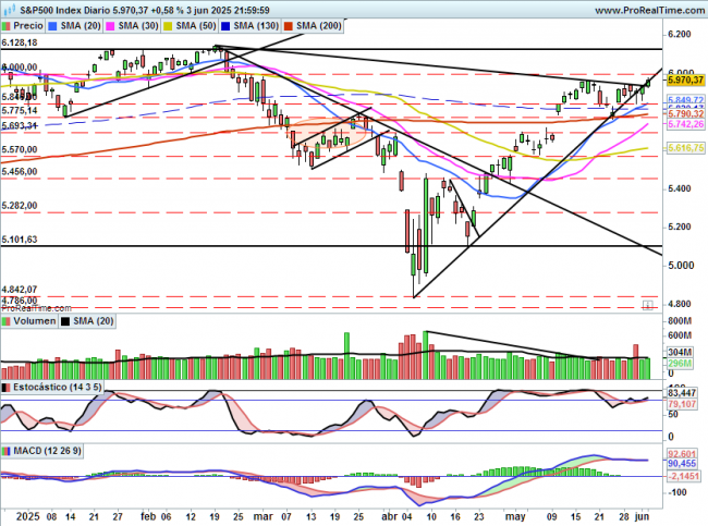 De momento aguanta, como hemos explicado días anteriores primera resistencia 6000 puntos y siguiente 6120 puntos.
