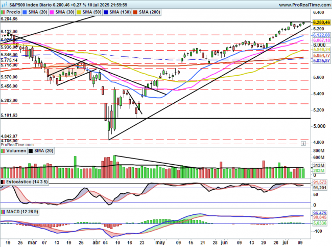 El mercado cerraba de nuevo en máximos históricos, en 6284 ,si bien no tuvo fuerza para superarlos y la volatilidad se mantiene extremadamente baja.