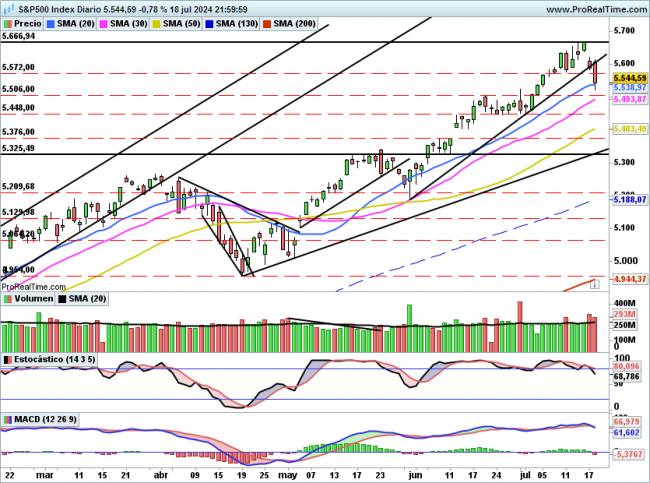 El índice ha roto la directriz alcista y el soporte de 5572 puntos , ello supone la primera señal claramente bajista en meses.