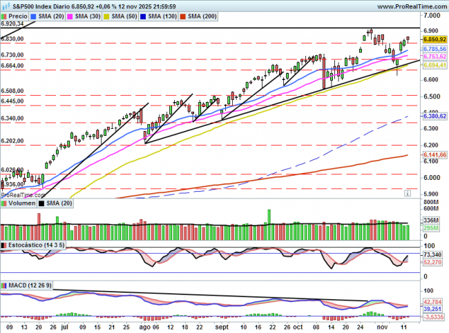De momento el índice se mantiene alcista y este debe ser el escenario base, ha superado la zona de 6830 puntos y como indicamos tiene vía libre hasta 6920 puntos, por encima entraría en subida libre.