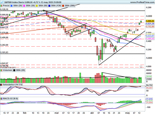 Por abajo peligro solo en caso de cierre del último GAP alcista, en cuyo caso el mercado podría buscar tapar los huecos que ha ido dejando, siendo los primeros objetivos 5775, 5570 y 5456 puntos.