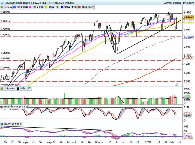 A corto si se mantiene por encima de 6880 el escenario es alcista con objetivo en 7000, un cierre por encima dejaría al índice en subida libre.