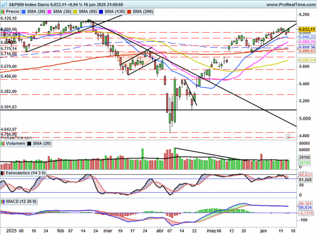 La situación poco o nada cambia, cierres por encima de 6040 dejan vía libre hacia el objetivo de 6120 puntos y por debajo perforar miniamos del viernes pues acelerarían caídas, siendo el primer nivel importante los 5780.