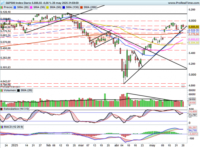 De momento sigue la situación un poco como estaba, el índice mantiene el soporte clave en 5775 y la resistencia clave también en 6000 puntos.