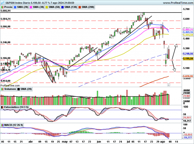 Para corto plazo todo sigue igual, como indicamos tiene soporte en el mínimo de mayo y GAP alcista del martes situado en 5186, si aguanta aquí todo sigue correcto, sigue siendo posible intentar la ruptura de 5346.