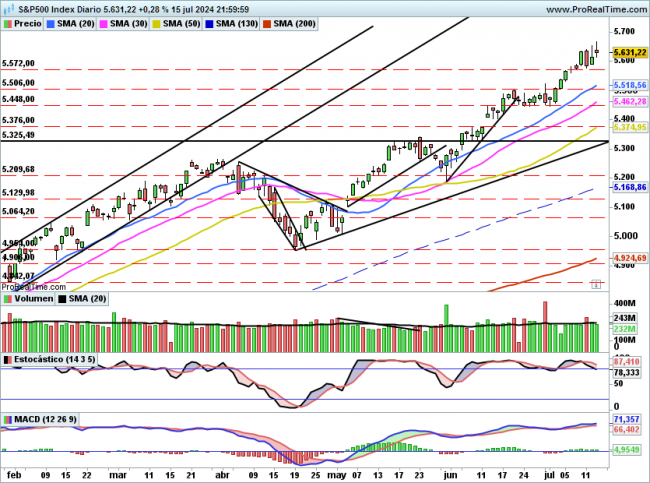 A corto lo mismo de todos los días, la subida libre se mantiene siempre que no pierda 5572, si esto ocurre, entonces si se podría pensar en una corrección de corto plazo aunque solo sea hasta la zona de 5450 puntos.