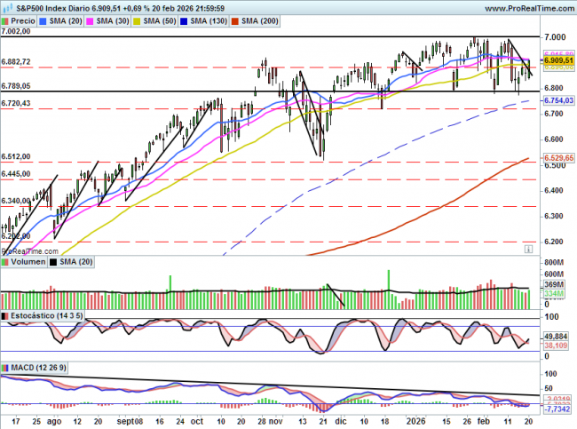 De momento el mercado ha conseguido saltar al cierre la resistencia de 6882, esto implica superar los máximos de últimos días, el 50% de la vela negativa del día 12 de febrero y a su vez la directriz bajista de corto plazo. No así las medias de 20 y 30 sesiones situadas en 6915 puntos.
