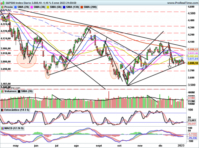 El soporte sigue estando en 3800, si rebota es posible ver una subida hacia los 3920 puntos y si cede el soporte de 3800 en semanal es posible ver una caída fuerte y rápida hacia la zona de 3700/3650 puntos.